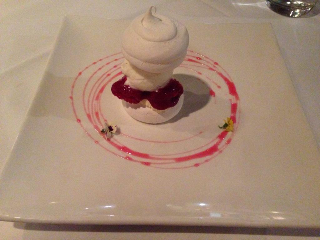 Macerated raspberries, white chocolate and raspberry ice cream.