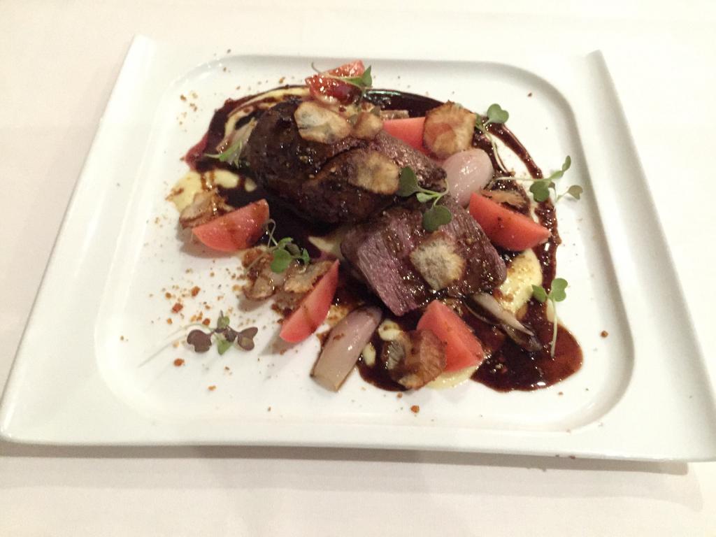 With juniper berries & sage. Jerusalem artichoke puree, artichoke crisps, radish, shallot petals, dukkah praline, Tasmanian highlands pepper leaf jus.