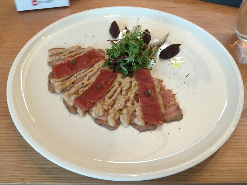There are lines of grey sauce on the veal. These are very fishy, and become the dominant taste of the dish, and make the whole thing taste like tuna mornay.